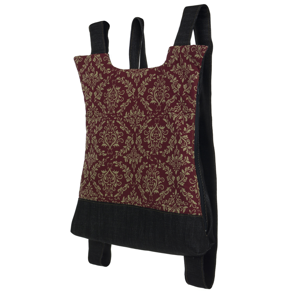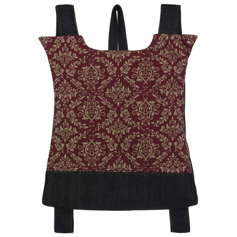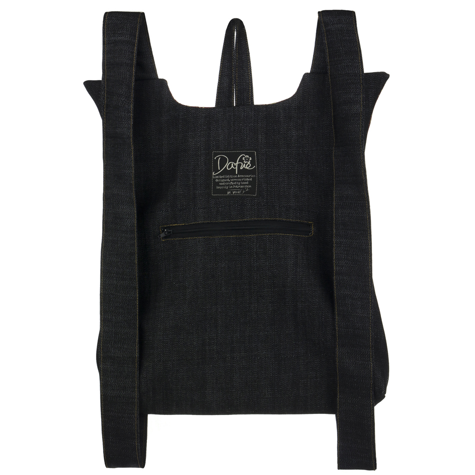 Το μπροστινό μέρος είναι λινό τυπωμένο με μελάνια νερού* και έχει πάτο από βαμβακερό ύφασμα. Το πίσω μέρος, όπως και ιμάντες, είναι βαμβάκι. Ανοίγει απο το πλάι με ενα φερμουαρ 30 εκατοστών. Η εσωτερική φόδρα είναι εφοδιασμένη με μια τσέπη με φερμουάρ. Στο πίσω μέρος το σακίδιο φέρει μια “κρυφή” εξωτερική τσέπη.