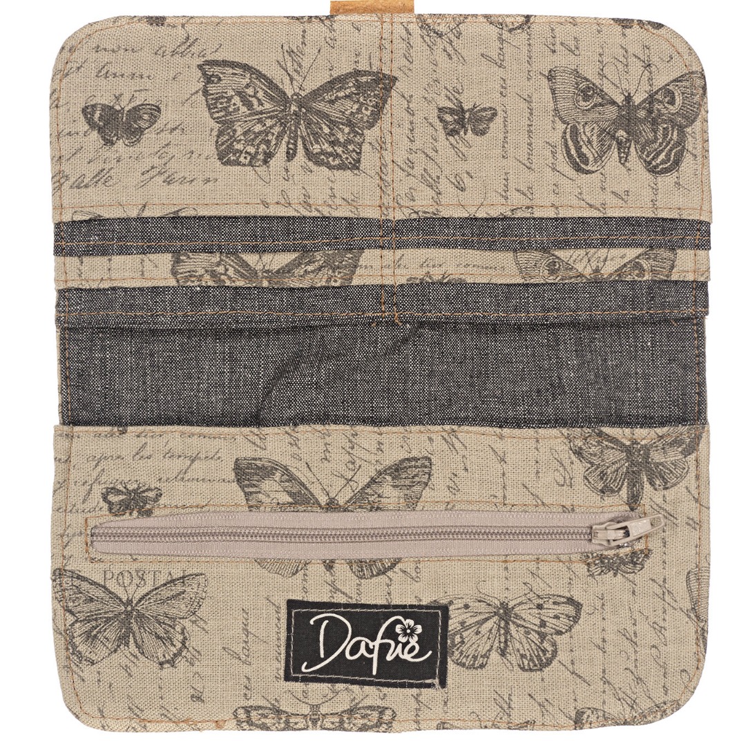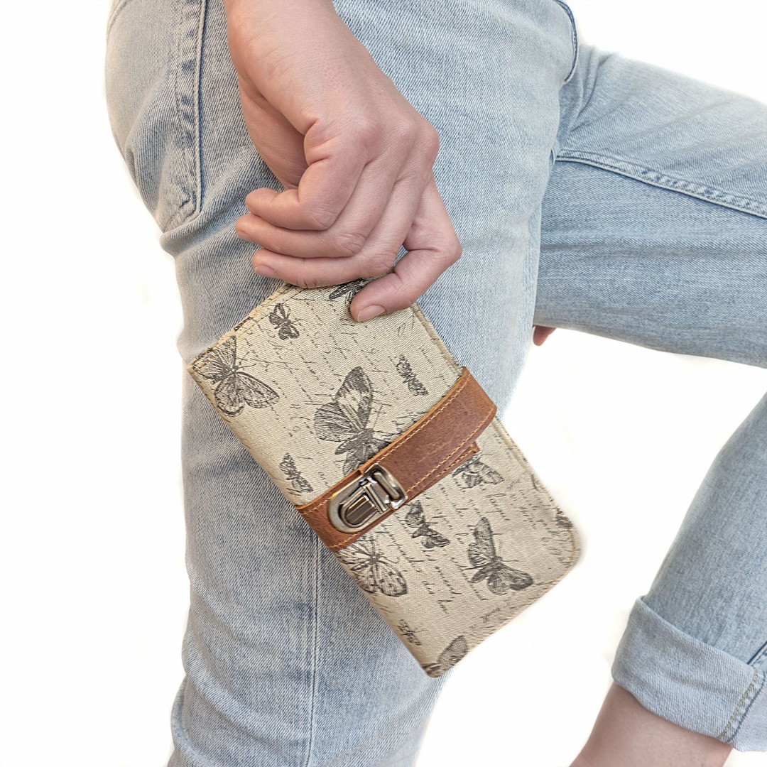 Οι συναλλαγές γίνονται πιο ευχάριστες, εύκολες και χαρούμενες με το Wallet. 'Εχει 6 θέσεις για κάρτες, 2 μεγάλες θέσεις για χαρτονομίσματα και μια ευρύχωρη θήκη με φερμουάρ. Το εξωτερικό μέρος όπως και μέρη του εσωτερικού είναι είναι λινό τυπωμένο με μελάνια νερού*. Το εσωτερικό μέρος, είναι βαμβάκι. Το περιμετρικό λουρί κλεισίματος είναι γνήσιο δέρμα μόσχου, φυτικής δέψης.