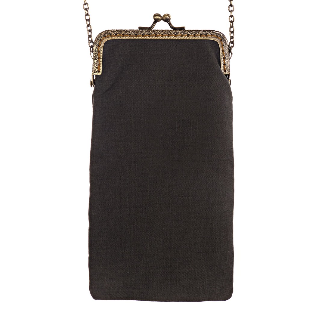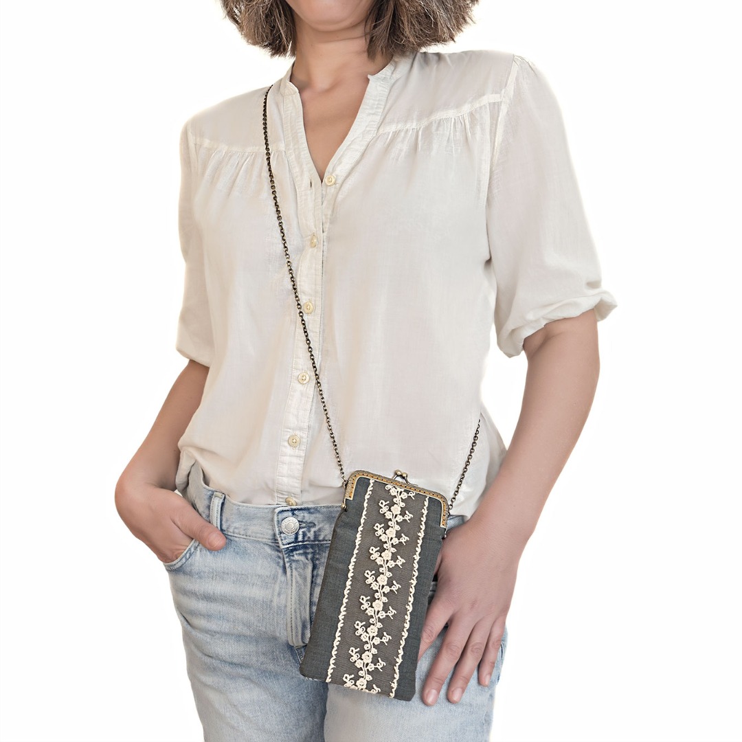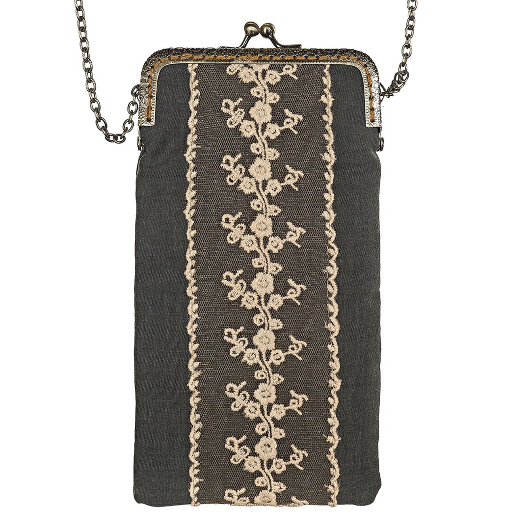 Όμορφη θήκη - τσαντάκι κινητού ή γυαλιών από βαμβακερό ύφασμα με δαντέλα βαμμένη στο χέρι. Εσωτερικά έχει μαλακή προστατευτική ενίσχυση αφού είναι φοδραρισμένο με πολυεστερικό καπιτονέ ύφασμα και βάτα. Η θήκη έχει λεπτή αλυσίδα μήκους 124 εκατοστών ώστε να μπορεί να φορεθεί στον ώμο ή χιαστί.