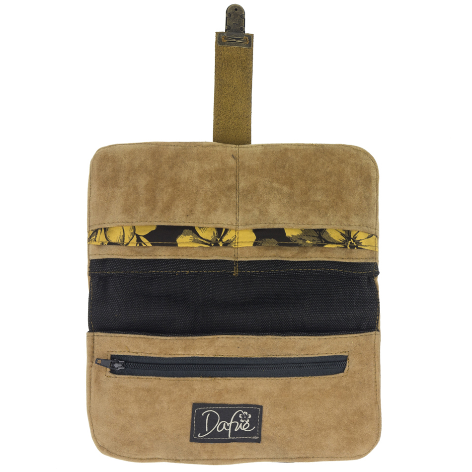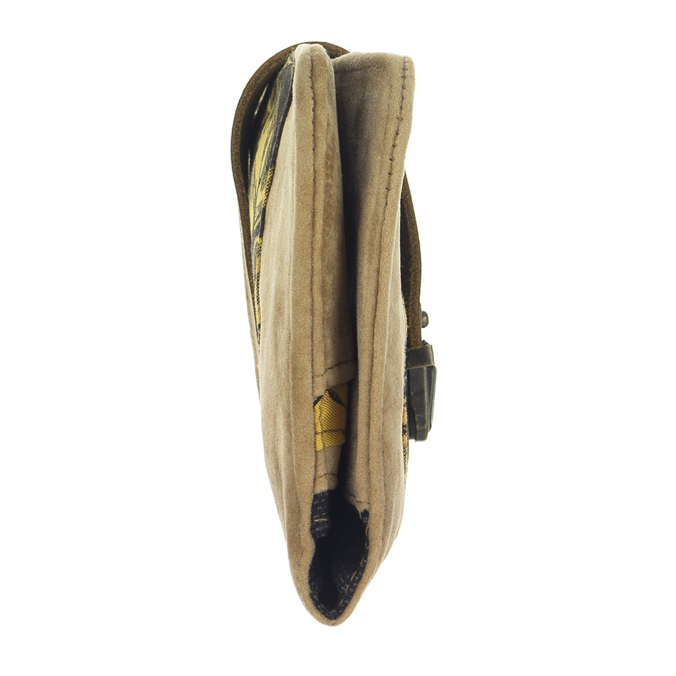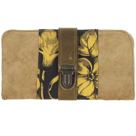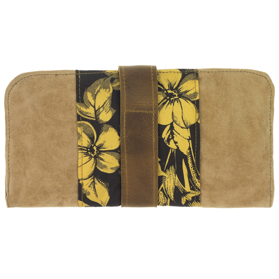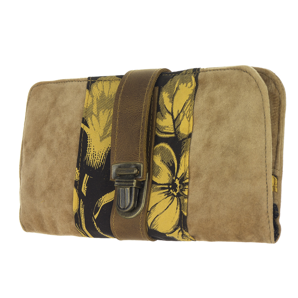 Το εξωτερικό μέρος είναι suede με φάσα από βαμβάκι τυπωμένο στο χέρι με οικολογικά μελάνια νεού*. Το εσωτερικό μέρος, είναι βαμβάκι και suede finished polyester. Το περιμετρικό λουρί κλεισίματος είναι γνήσιο δέρμα μόσχου, φυτικής δέψης