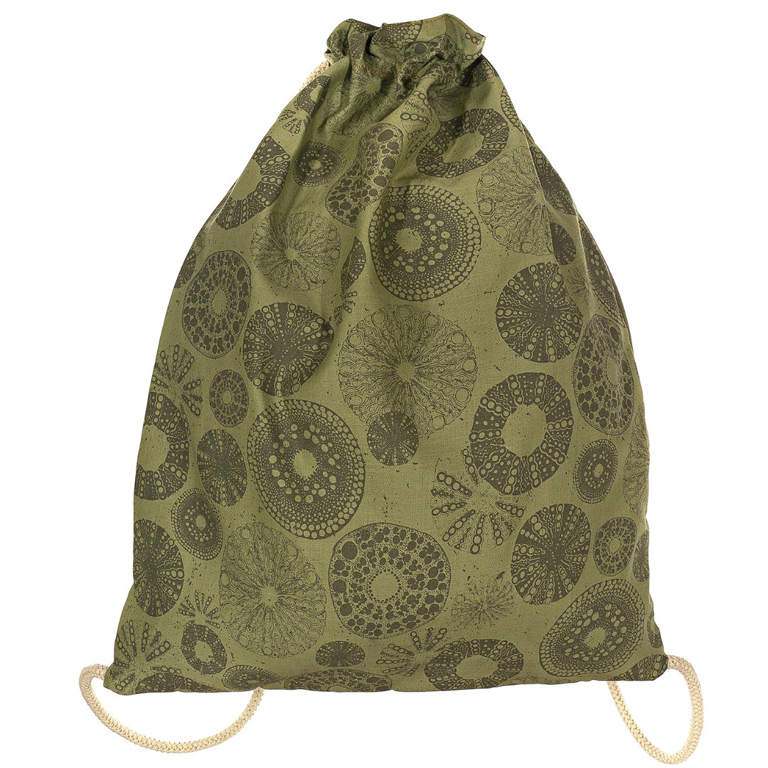 Το μπροστινό μέρος είναι λινό τυπωμένο με μελάνια νερού*. To πίσω μέρος, όπως και τα κορδόνια, είναι από βαμβάκι. Η εσωτερική φόδρα είναι εφοδιασμένη με μια τσέπη με φερμουάρ.