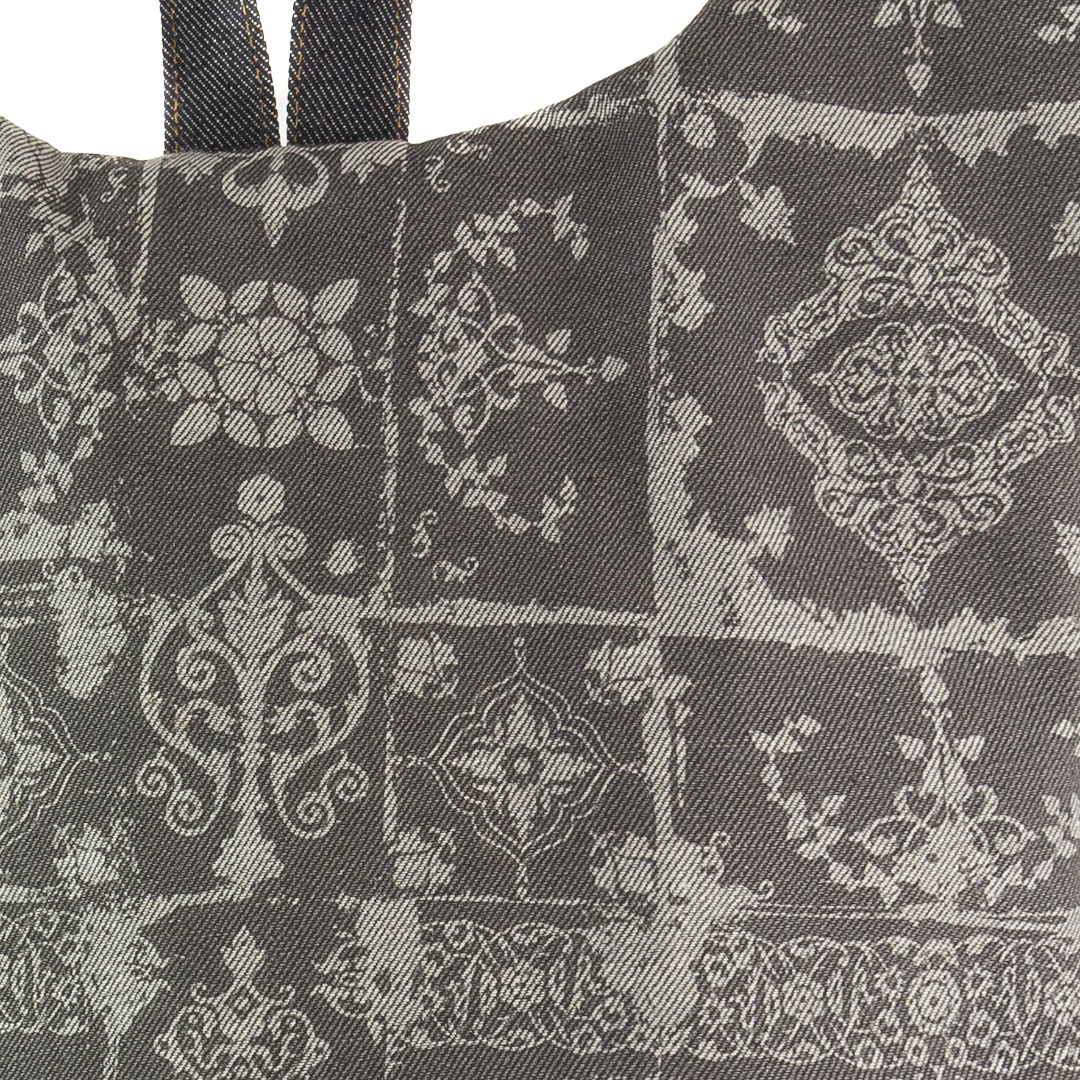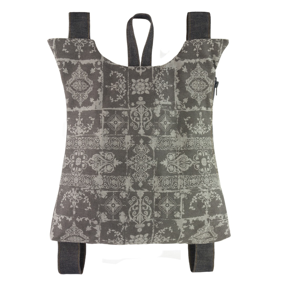 Το μπροστινό μέρος είναι βαμβάκι τυπωμένο με μελάνια νερού* και το πίσω μέρος, όπως και ιμάντες, είναι βαμβάκι. Ανοίγει απο το πλάι με ενα φερμουαρ 30 εκατοστών. Η εσωτερική φόδρα είναι εφοδιασμένη με μια τσέπη με φερμουάρ. Στο πίσω μέρος το σακίδιο φέρει μια “κρυφή” εξωτερική τσέπη.