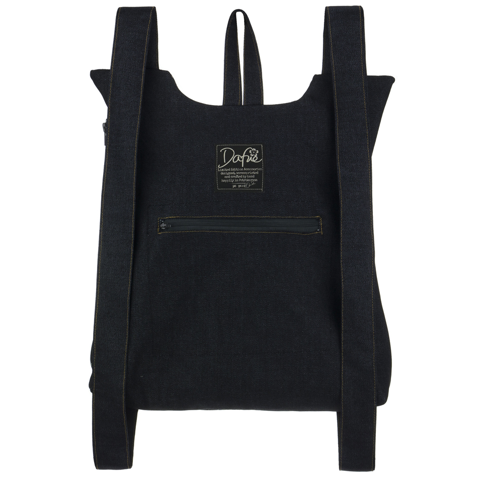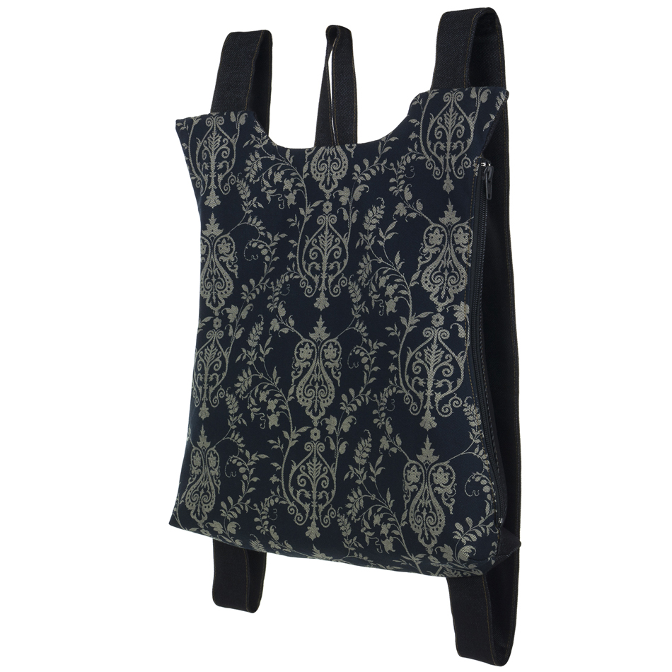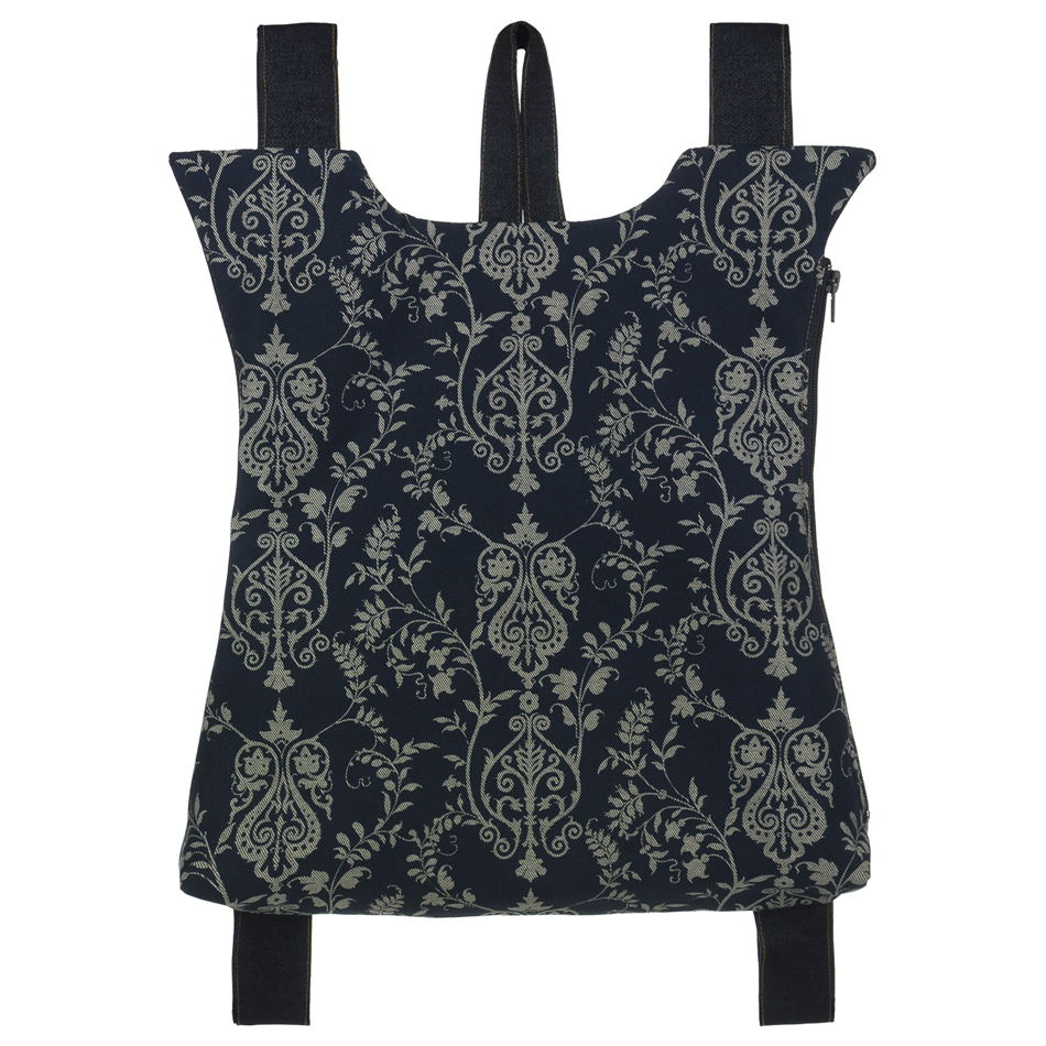 Το μπροστινό μέρος είναι βαμβάκι τυπωμένο με μελάνια νερού* και το πίσω μέρος, όπως και ιμάντες, είναι βαμβάκι. Ανοίγει απο το πλάι με ενα φερμουαρ 30 εκατοστών. Η εσωτερική φόδρα είναι εφοδιασμένη με μια τσέπη με φερμουάρ. Στο πίσω μέρος το σακίδιο φέρει μια “κρυφή” εξωτερική τσέπη.