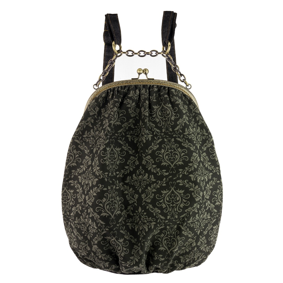 Το μπροστινό μέρος είναι βαμβακερό τυπωμένο με μελάνια νερού* και το πίσω, όπως και οι ρυθμιζόμενοι ιμάντες, είναι βαμβάκι. Η εσωτερική φόδρα είναι λινή εφοδιασμένη με μια τσέπη με φερμουάρ. Στο πίσω μέρος το σακίδιο φέρει μια “κρυφή” εξωτερική τσέπη. Οι ιμάντες εκτός από το μήκος ρυθμίζονται με έναν κρίκο που ανοίγει, ως προς τη θέση που θέλουμε να συνδέονται με την αλυσίδα – χερούλι. Το κλείστρο είναι μεταλλικό ραμμένο στο χέρι.