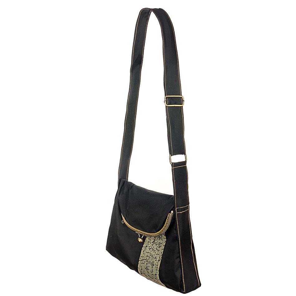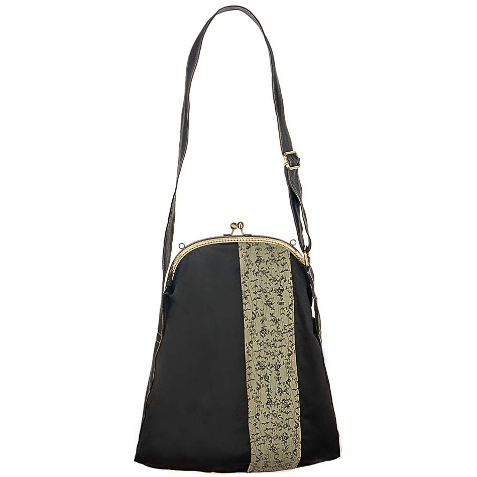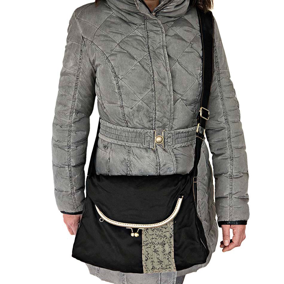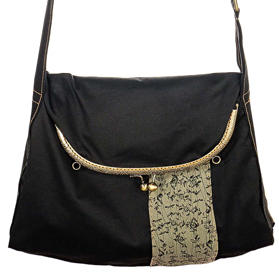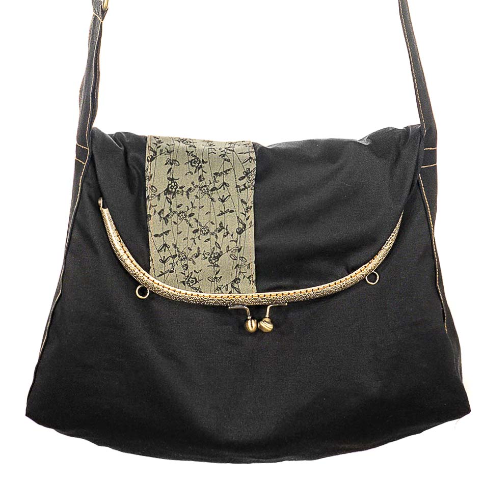 Η τσάντα και οι ρυθμιζόμενοι ιμάντες είναι από βαμβάκι. Στη μία μεριά έχει φάσα από βαμβάκι τυπωμένο με μελάνια νερού*. Η άλλη μεριά είναι μονόχρωμη βαμβακερή Η εσωτερική φόδρα είναι εφοδιασμένη με μια τσέπη με φερμουάρ. Ο ραφτός βαμβακερός ιμάντας μήκους 122cm ρυθμίζεται δίνοντας τη δυνατότητα στην τσάντα να φορεθεί σαν ώμου ή cross body. Τo κλείστρο είναι μεταλλικό ραμμένο στο χέρι.