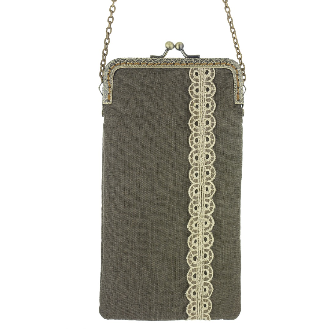 Όμορφη θήκη - τσαντάκι κινητού ή γυαλιών από λινό ύφασμα με δαντέλα. Εσωτερικά έχει μαλακή προστατευτική ενίσχυση αφού είναι φοδραρισμένο με πολυεστερικό καπιτονέ ύφασμα και βάτα. Η θήκη έχει λεπτή αλυσίδα μήκους 124 εκατοστών ώστε να μπορεί να φορεθεί στον ώμο ή χιαστί.