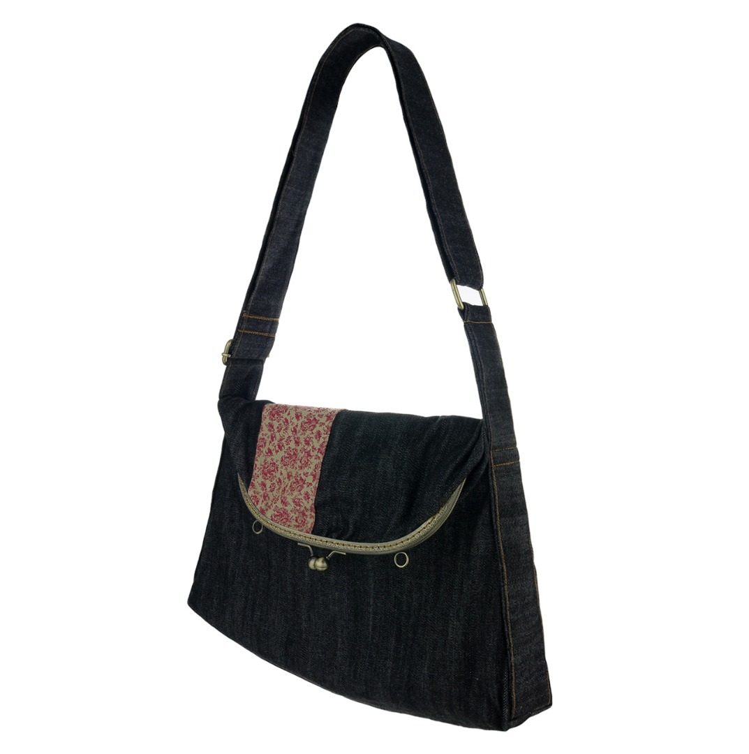 Η τσάντα και οι ρυθμιζόμενοι ιμάντες είναι από βαμβάκι. Στη μία μεριά έχει κάθετη φάσα λινό ύφασμα τυπωμένο με μελάνια νερού*. Η άλλη μεριά είναι μονόχρωμο jean. Η εσωτερική φόδρα είναι εφοδιασμένη με μια τσέπη με φερμουάρ. Ο ραφτός βαμβακερός ιμάντας μήκους 122cm ρυθμίζεται δίνοντας τη δυνατότητα στην τσάντα να φορεθεί σαν ώμου ή cross body. Τo κλείστρο είναι μεταλλικό ραμμένο στο χέρι.