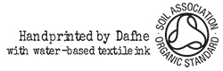 * όλες οι εκτυπώσεις των υφασμάτων Dafne σχεδιάζονται και τυπώνονται με μεταξοτυπία στο χέρι, με οικολογικά χρώματα χωρίς διαλύτες πιστοποιημένα από το Soil Association Certification Ltd ως οργανικά και σύμφωνα με το πρότυπο ɶko-Tex standard 100 class 1