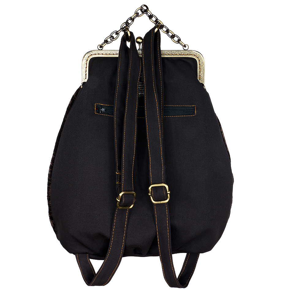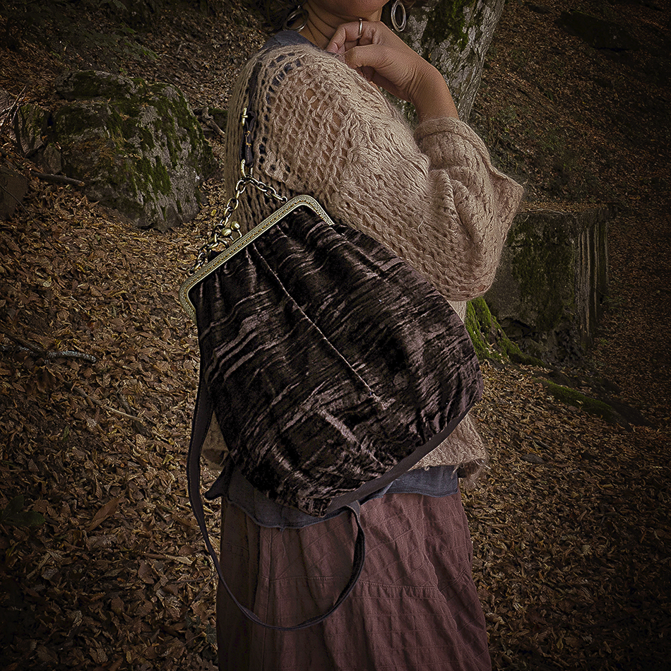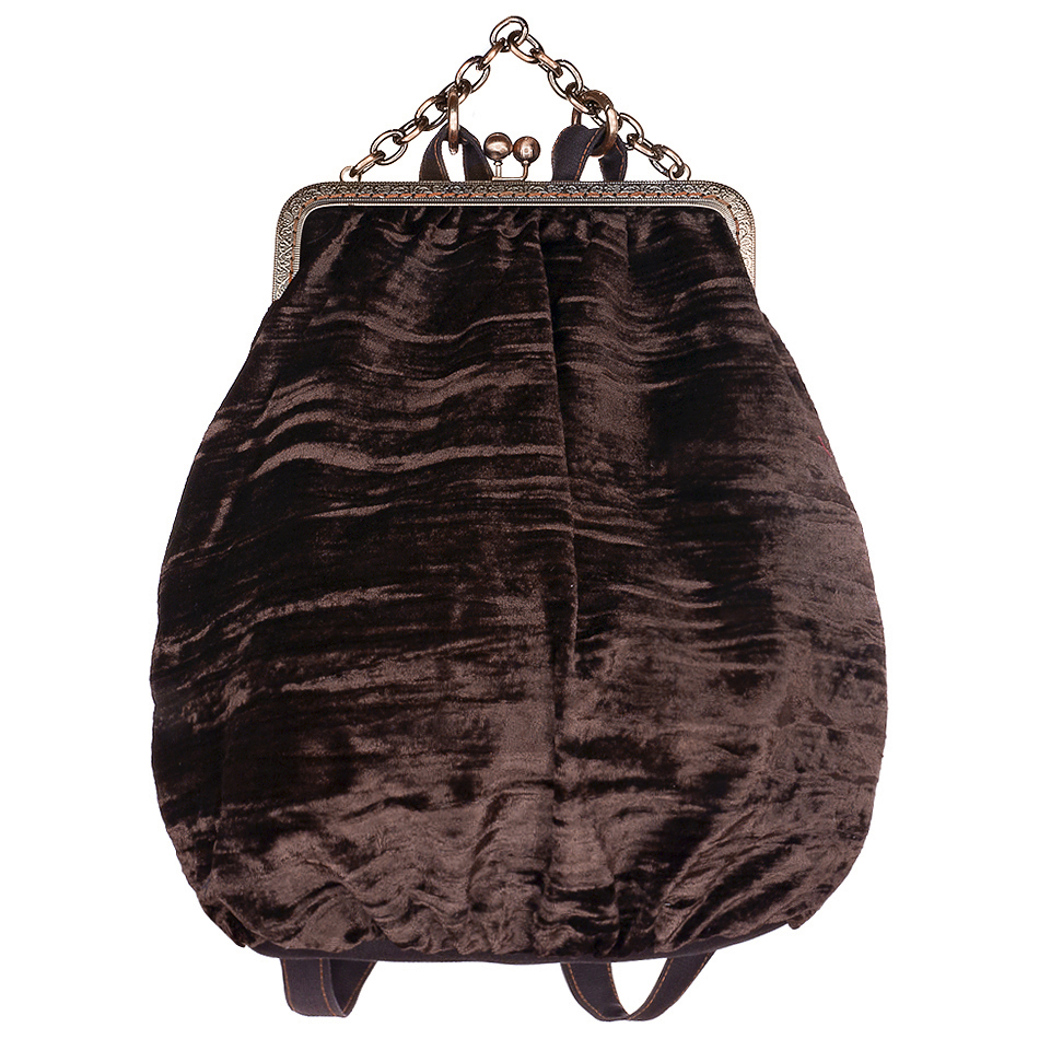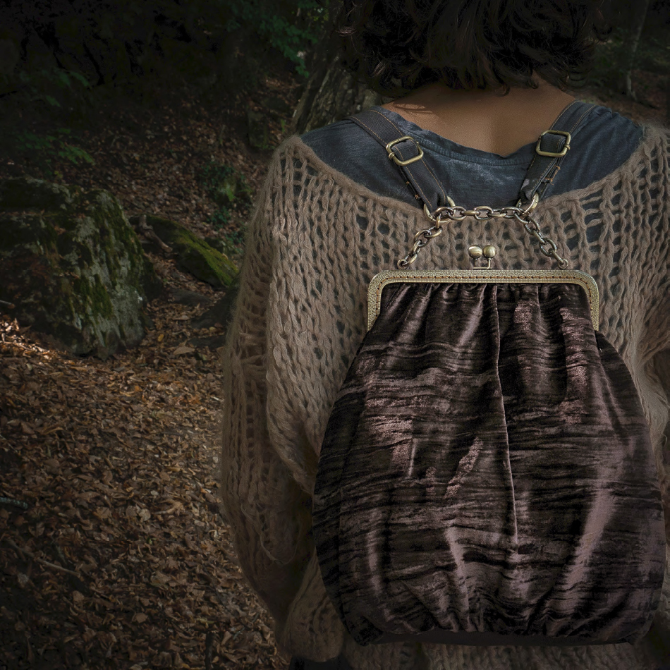 Το μπροστινό μέρος είναι βελούδο και το πίσω μέρος, όπως και οι ρυθμιζόμενοι ιμάντες, είναι βαμβάκι. Η εσωτερική φόδρα είναι λινή εφοδιασμένη με μια τσέπη με φερμουάρ. Στο πίσω μέρος το σακίδιο φέρει μια “κρυφή” εξωτερική τσέπη. Οι ιμάντες εκτός από το μήκος ρυθμίζονται με έναν κρίκο που ανοίγει, ως προς τη θέση που θέλουμε να συνδέονται με την αλυσίδα – χερούλι. Το κλείστρο είναι μεταλλικό ραμμένο στο χέρι.