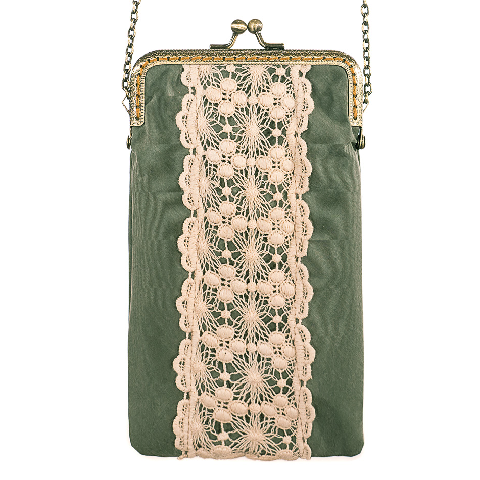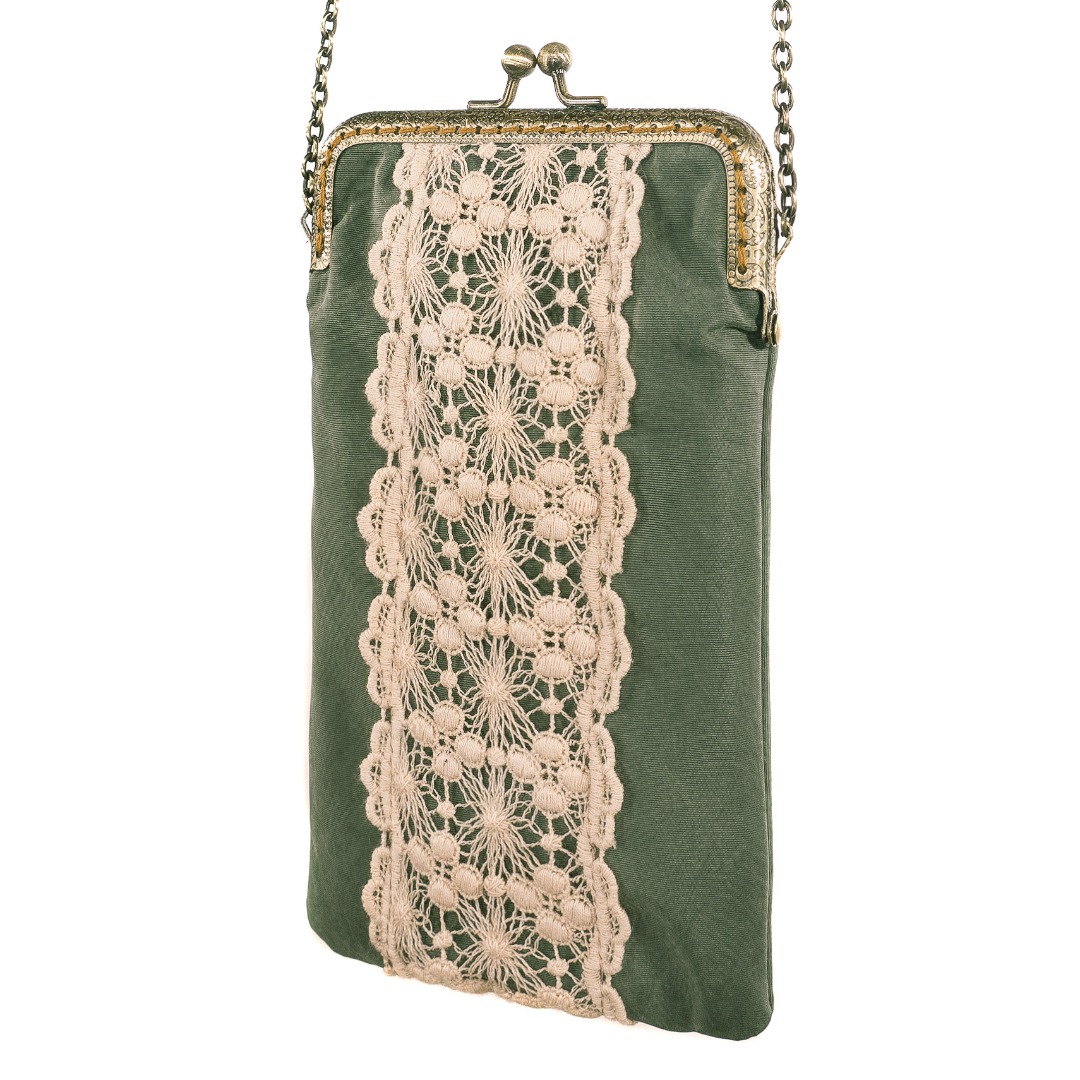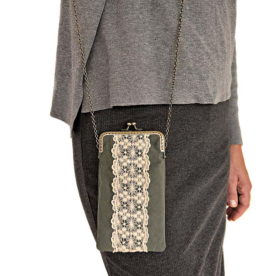 Όμορφη θήκη - τσαντάκι κινητού ή γυαλιών από βαμβακερό ύφασμα με δαντέλα βαμμένη στο χέρι. Εσωτερικά έχει μαλακή προστατευτική ενίσχυση αφού είναι φοδραρισμένο με πολυεστερικό καπιτονέ ύφασμα και βάτα. Η θήκη έχει λεπτή αλυσίδα μήκους 124 εκατοστών ώστε να μπορεί να φορεθεί στον ώμο ή χιαστί.