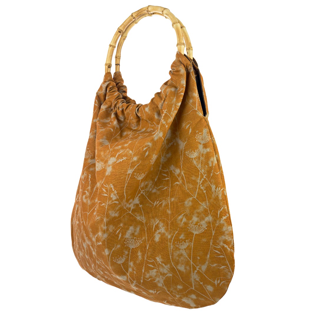 Ευρύχωρη και στυλάτη τσάντα με χερούλια από μπαμπού. Τα χερούλια έχουν εσωτερική διάμετρο 17εκ και είναι αρκετά μεγάλα ώστε να μπορούν με άνεση να φορεθεί η τσάντα στον ώμο, να κρατηθεί στο χέρι ή στον αγκώνα. Η τσάντα είναι κατασκευασμένη από λινό, τυπωμένο στο χέρι με πιστοποιημένα οικολογικά μελάνια νερού*.