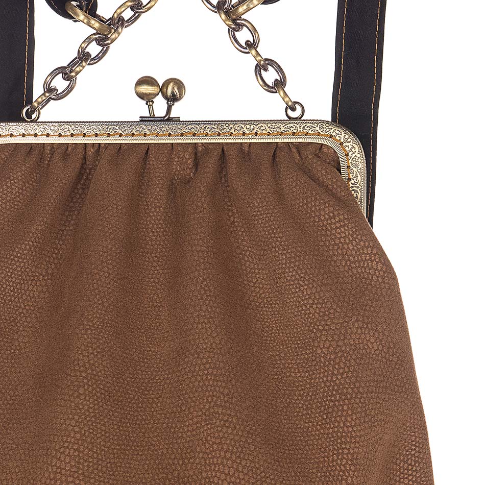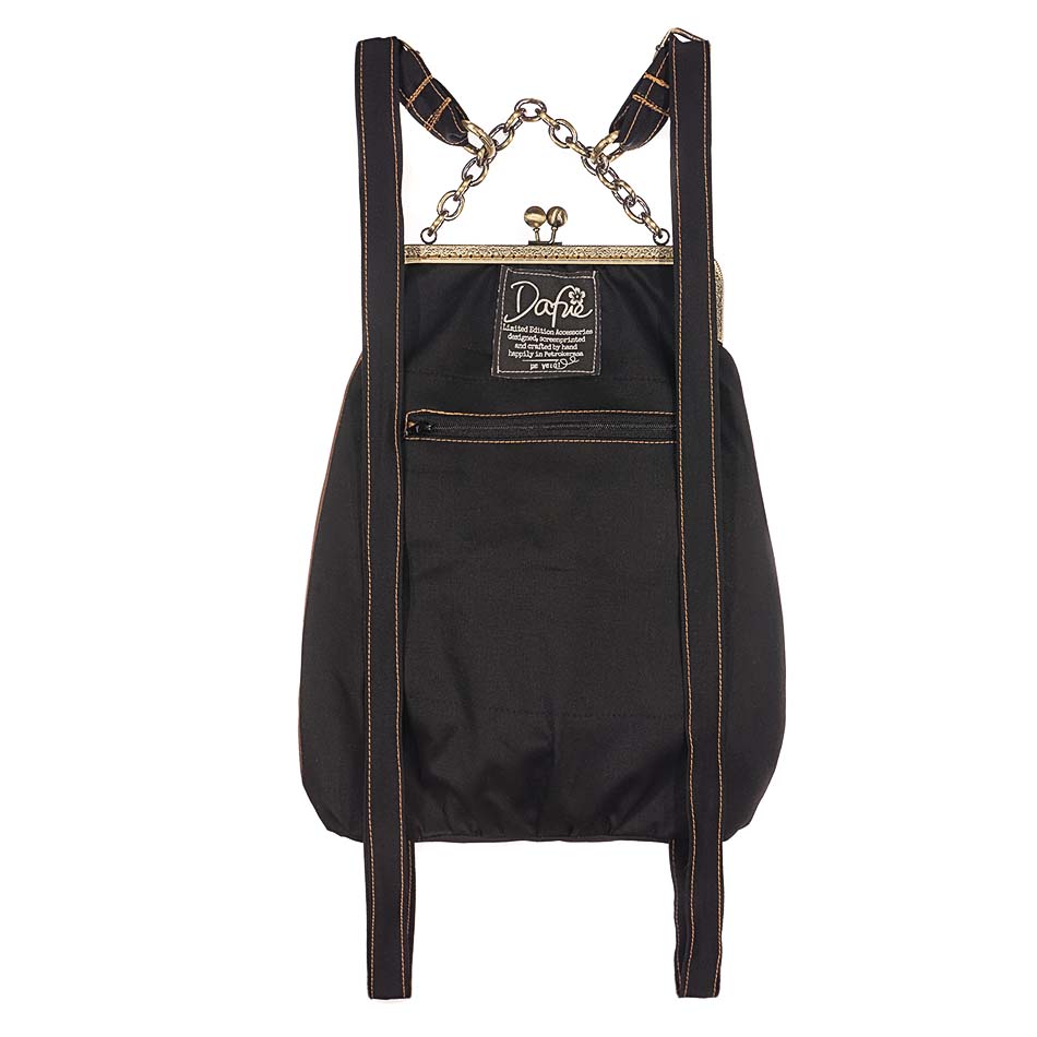 Το μπροστινό μέρος είναι leather finished polyester και το πίσω μέρος, όπως και οι ρυθμιζόμενοι ιμάντες, είναι βαμβάκι. Η εσωτερική φόδρα είναι λινή εφοδιασμένη με μια τσέπη με φερμουάρ. Στο πίσω μέρος το σακίδιο φέρει μια “κρυφή” εξωτερική τσέπη. Οι ιμάντες εκτός από το μήκος ρυθμίζονται με έναν κρίκο που ανοίγει, ως προς τη θέση που θέλουμε να συνδέονται με την αλυσίδα – χερούλι. Το κλείστρο είναι μεταλλικό ραμμένο στο χέρι.