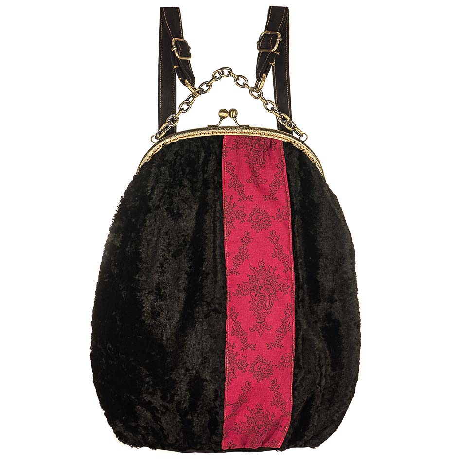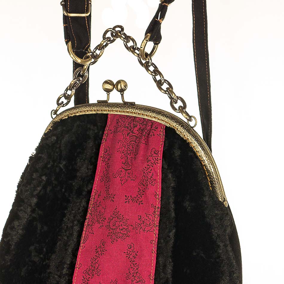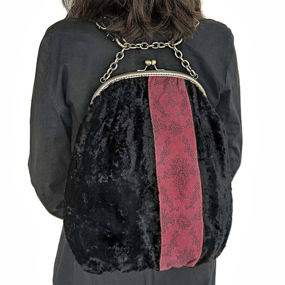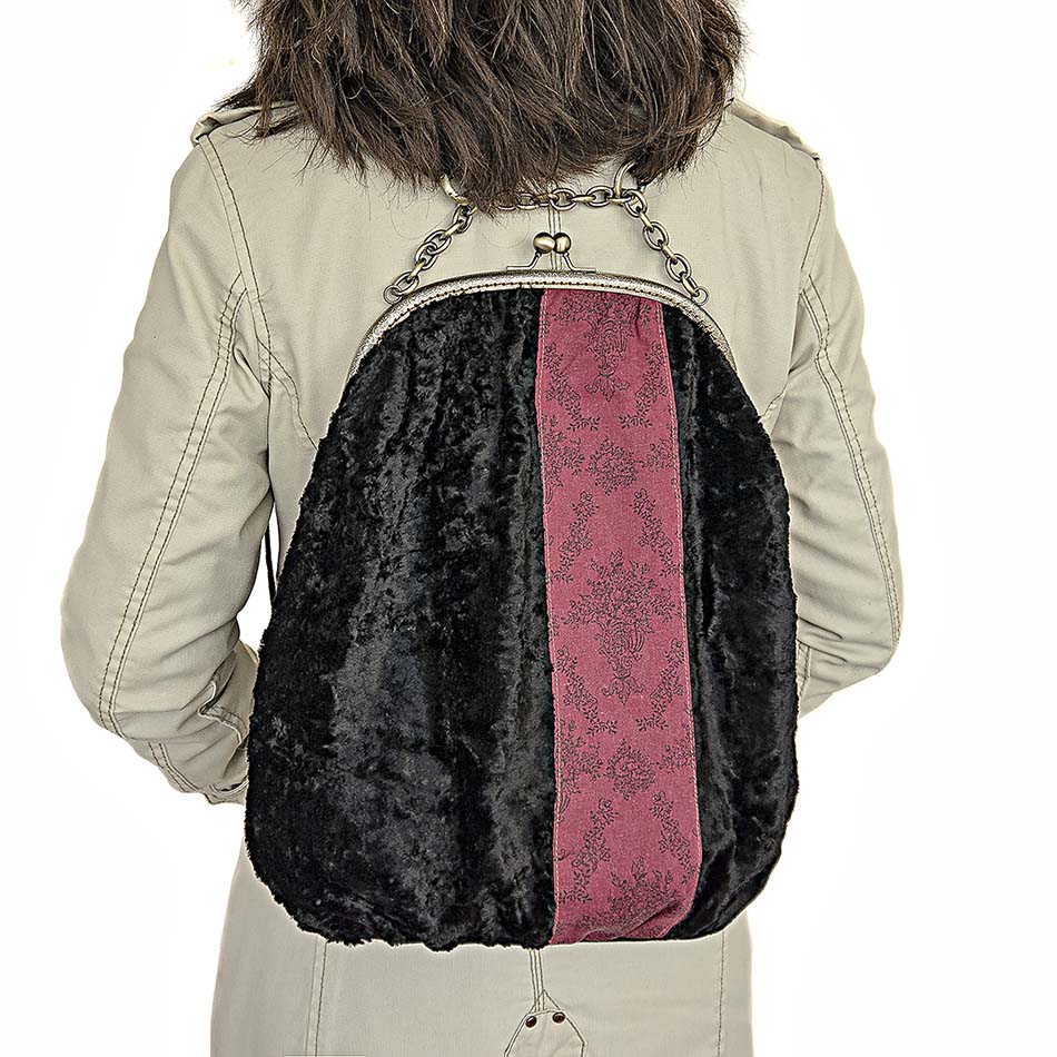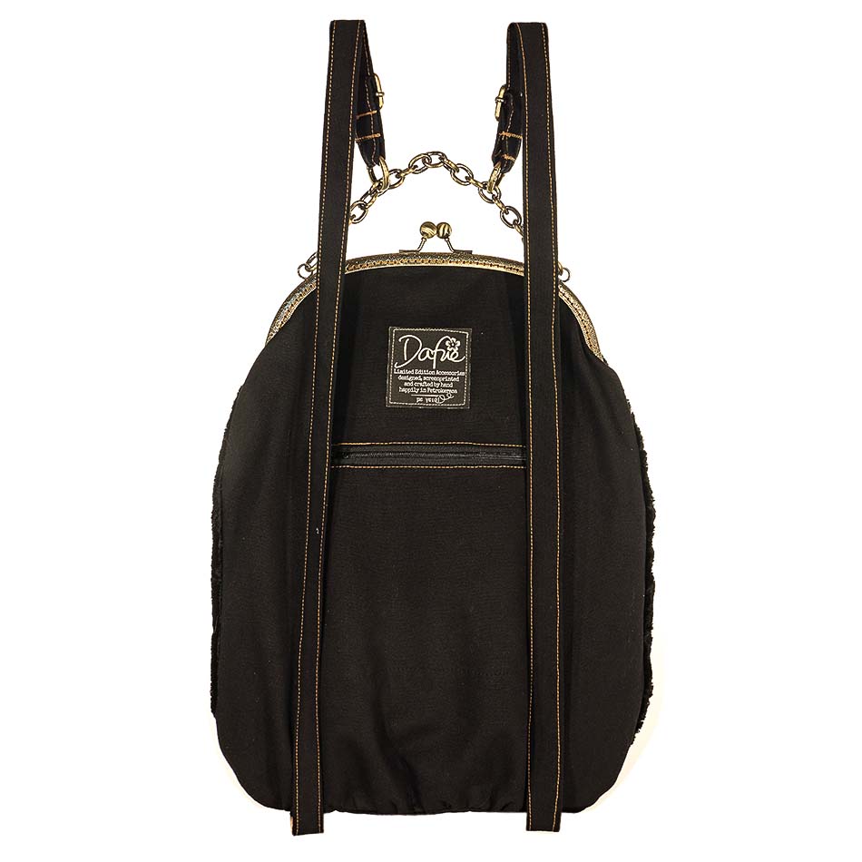 Το μπροστινό μέρος είναι βελούδινο με μακρυ πέλος και έχει κάθετη φάσα από λινό ύφασμα τυπωμένο στο χέρι με μελάνια νερού*. Το πίσω μέρος, όπως και οι ρυθμιζόμενοι ιμάντες, είναι βαμβάκι. Η εσωτερική φόδρα είναι εφοδιασμένη με μια τσέπη με φερμουάρ. Στο πίσω μέρος το σακίδιο φέρει μια “κρυφή” εξωτερική τσέπη. Οι ιμάντες εκτός από το μήκος ρυθμίζονται με έναν κρίκο που ανοίγει, ως προς τη θέση που θέλουμε να συνδέονται με την αλυσίδα – χερούλι. Το κλείστρο είναι μεταλλικό ραμμένο στο χέρι.