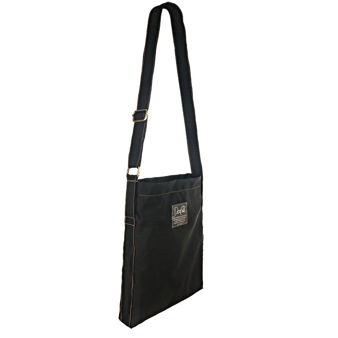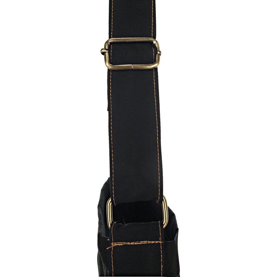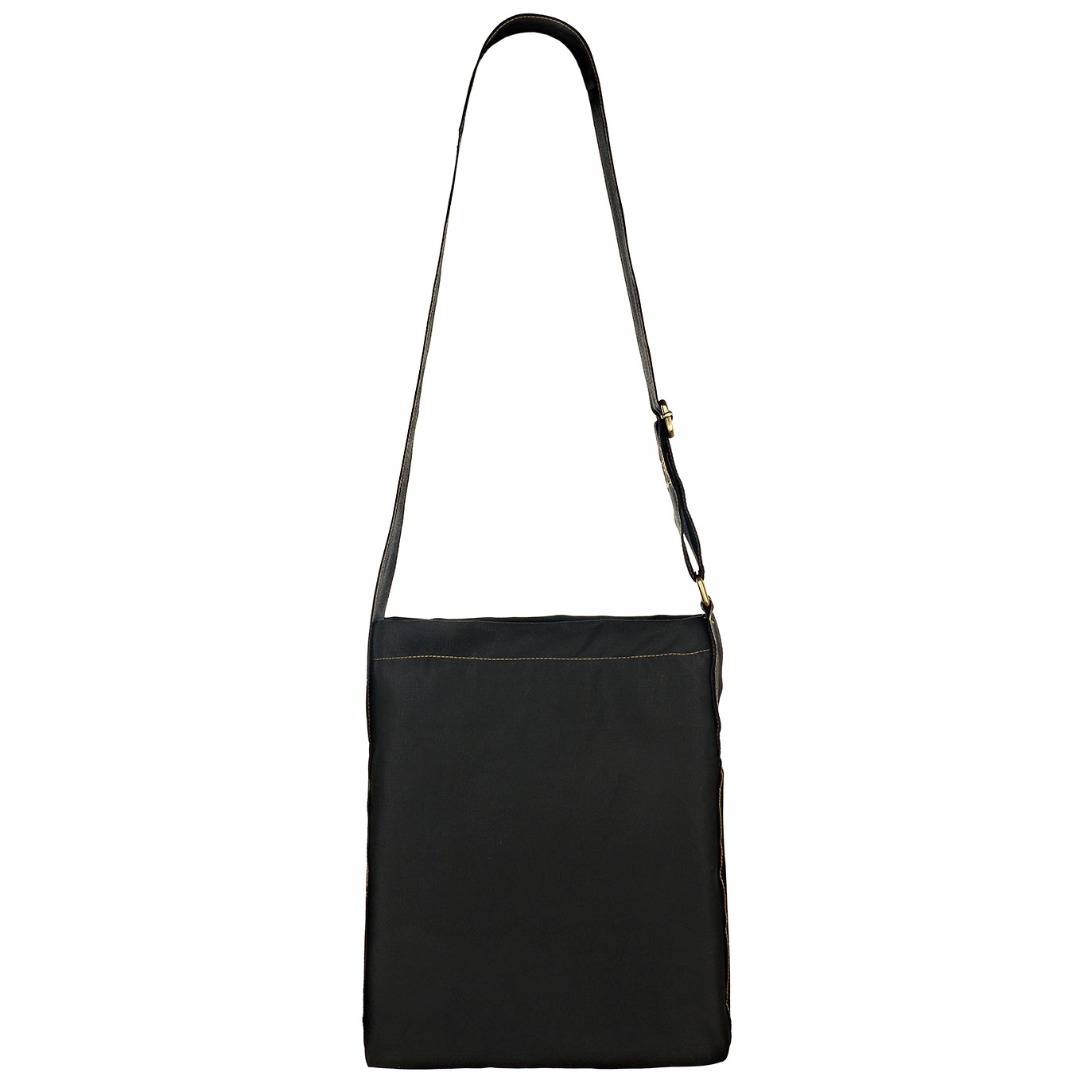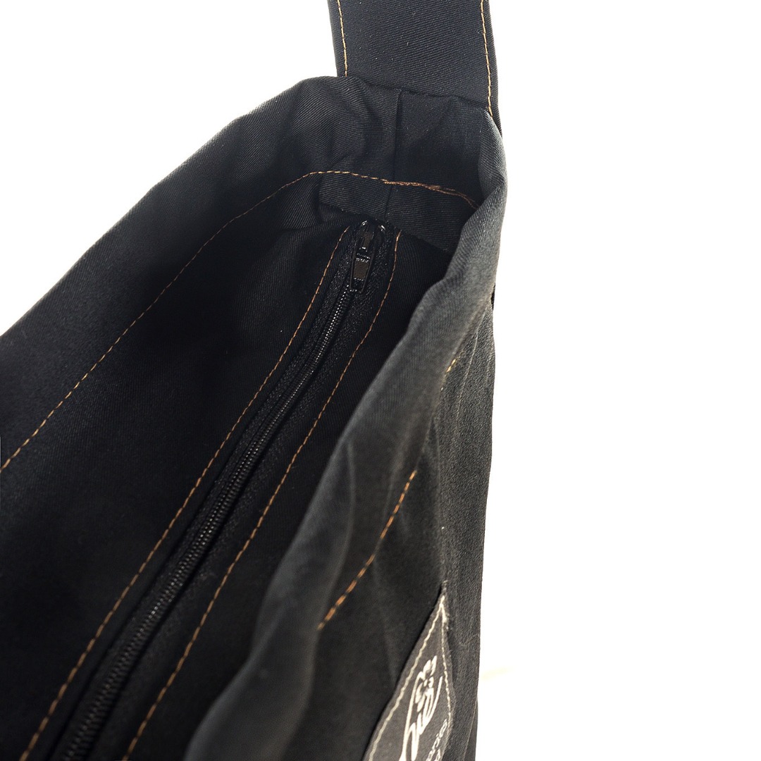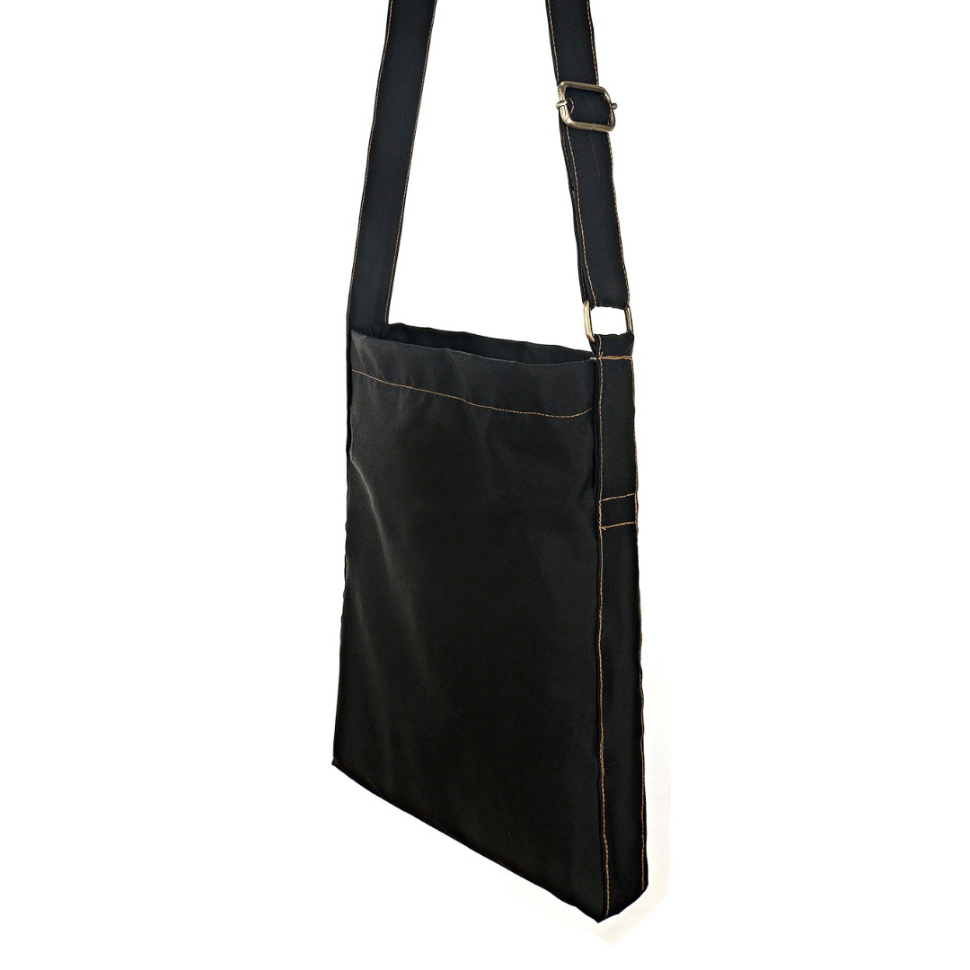 Η συγκεκριμένη είναι δουλεμένη σε βαμβακερό ύφασμα. Η τσάντα έχει συνολικό ύψος 33 cm, στη βάση της είναι 29 cm και το φερμουάρ στο επάνω μέρος έχει μήκος 23 cm. Ο ιμάντας προσαρμόζεται πολύ εύκολα στο μήκος χάρη στο υλικό και τους μεταλλικούς προσαρμογείς και πλήρως ανοιγμένος έχει μήκος 114 cm. Στο επάνω μέρος η τσάντα κλείνει με φερμουάρ και εσωτερικά έχει μια τσέπη με φερμουάρ.